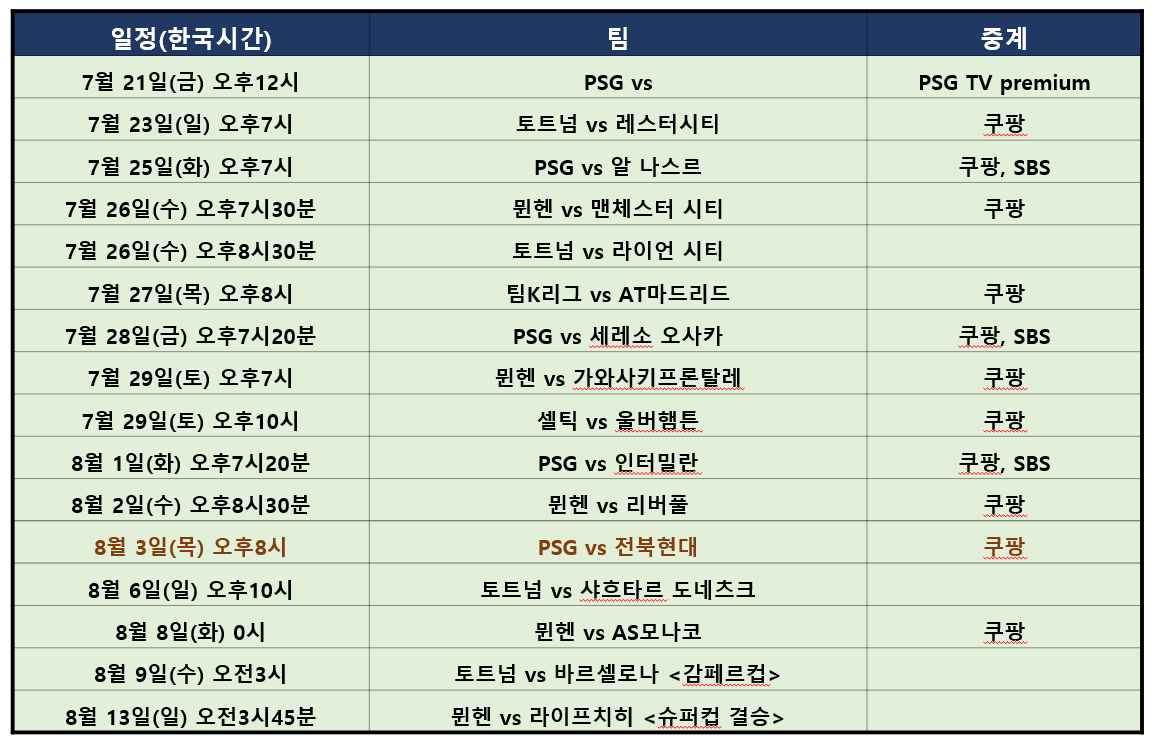 이에 유럽 축구리그에서 뛰고 있는 손흥민(토트넘), 이강인(PSG), 김민재(뮌헨) 등의 주요 한국선수들의 프리시즌 경기일정과 중계여부 등에 대해 알아보겠습니다.